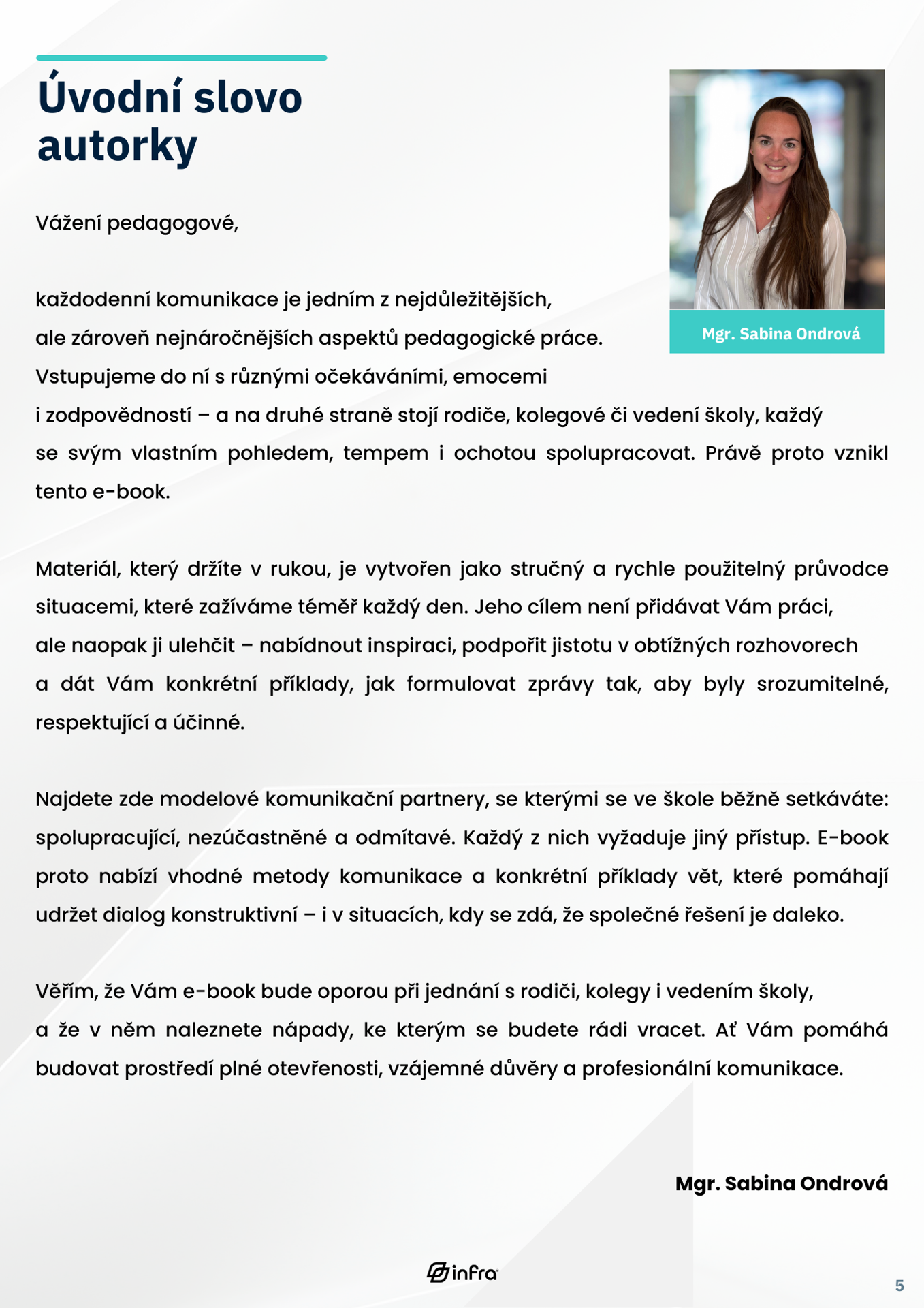 Tento komunikační e-book je praktickou příručkou určenou učitelům, kteří chtějí zvládat každodenní komunikaci s jistotou, klidem a profesionalitou. Jeho cílem je poskytnout konkrétní, srozumitelný a okamžitě použitelný nástroj pro komunikaci s rodiči, kolegy i vedením školy.