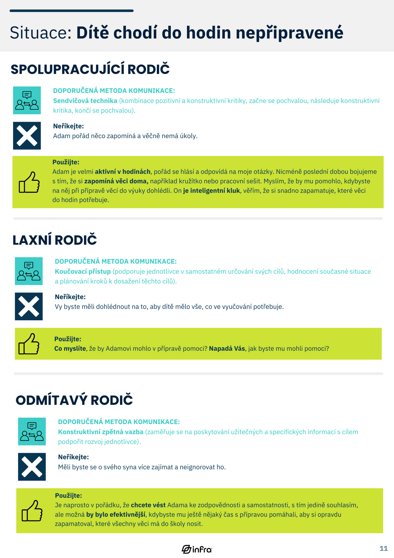 U každé komunikační situace popsané v e-booku vystupují tři typy komunikačních partnerů: spolupracující, laxní a odmítavý, uvedené jsou i doporučené metody komunikace a praktická ukázka, jak metodu aplikovat.