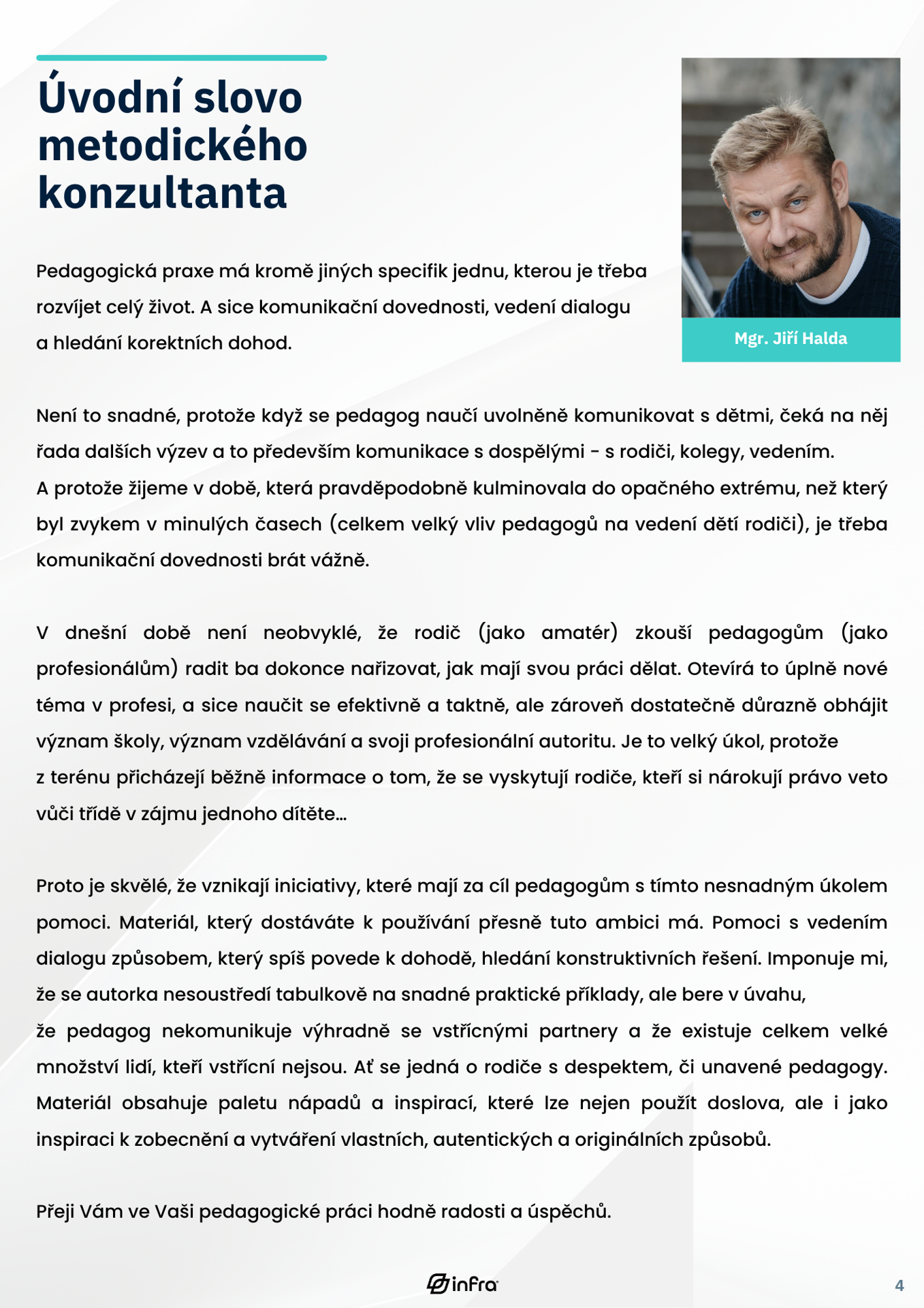 Metodickým konzultantem publikace je Mgr. Jiří Halda, uznávaný psycholog, který se dlouhodobě věnuje oblasti komunikace a sám vede vzdělávací kurzy zaměřené na komunikační dovednosti. „Krásné na životě, ale i na pedagogické praxi je, že se lze stále něco nového učit, a tak sobě i druhým lépe rozumět.“