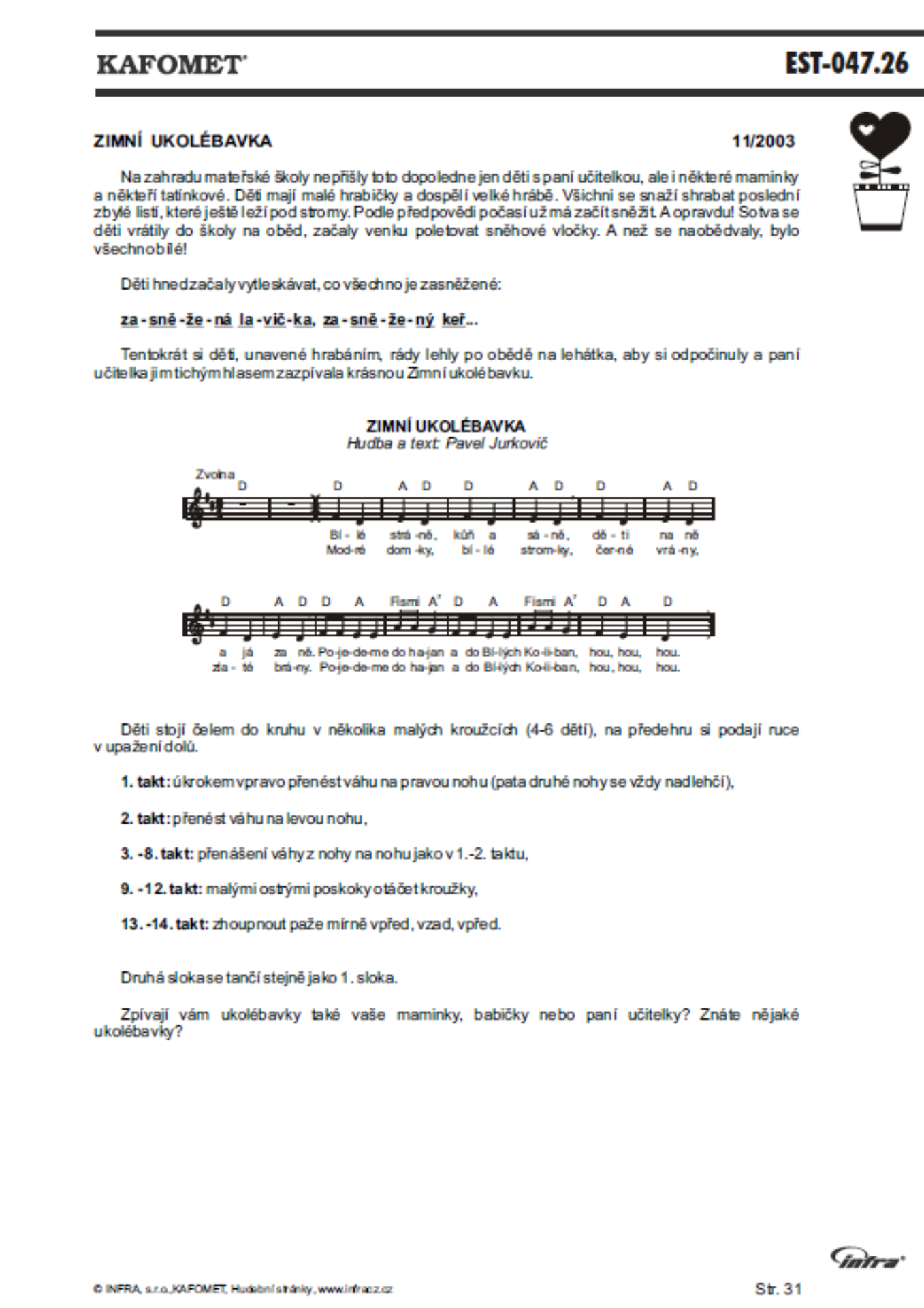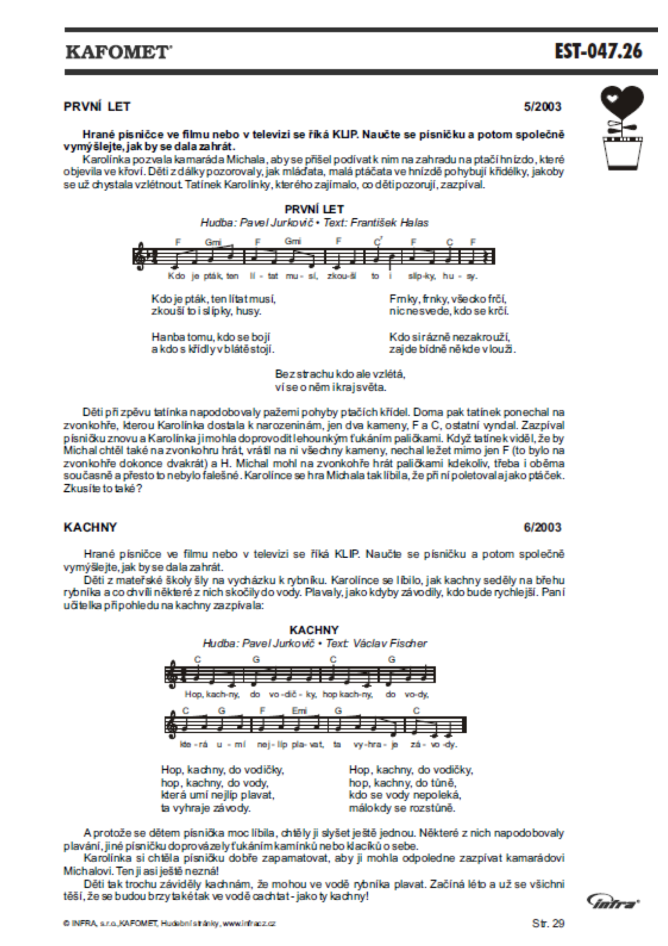 V publikaci najdete písničky Pavla Jurkoviče a lidové písničky, které Eva Hurdová doprovodila návody a motivačními texty, aby tak písničky projevily svoji životnost a propojení s reálným světem, a aby inspirovaly k tanečnímu pohybu. Skrze pohyb se i nápěv lépe zabydlí v paměti, posílí rytmické cítění a často vyvolá i ten správný hudební výraz.